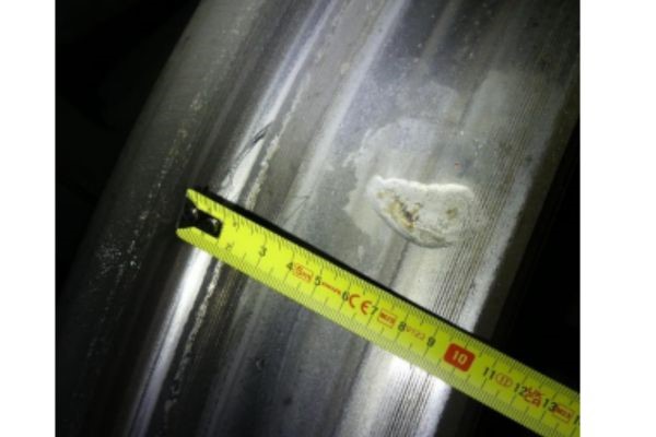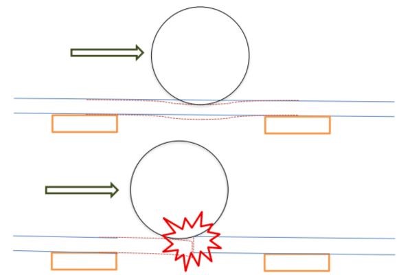 Imágenes extraídas de la nota de la CIAF sobre la investigación del accidente de Adamuz: Posible mecanismo de formación de las marcas en las ruedas en caso de haber una rotura de la continuidad del carril. Arriba se muestra el funcionamiento normal (la deformación está exagerada por motivos de claridad): todo el carril se deforma solidariamente bajo el peso de las ruedas. Abajo, efecto producido por la rotura del carril: sólo se deforma la parte sobre la que está la rueda, generándose un escalón contra el que se golpea.