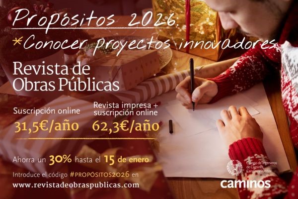 El Colegio de Ingenieros de Caminos, Canales y Puertos ha lanzado la campaña “Propósitos 2026”, para ofrecer un 30% de descuento en la suscripción a la Revista de Obras Públicas, hasta el 15 de enero. Esta promoción está dirigida a nuevos suscriptores y tiene una duración de un año desde el día del registro. Los pasos a seguir para conseguir el descuento son: