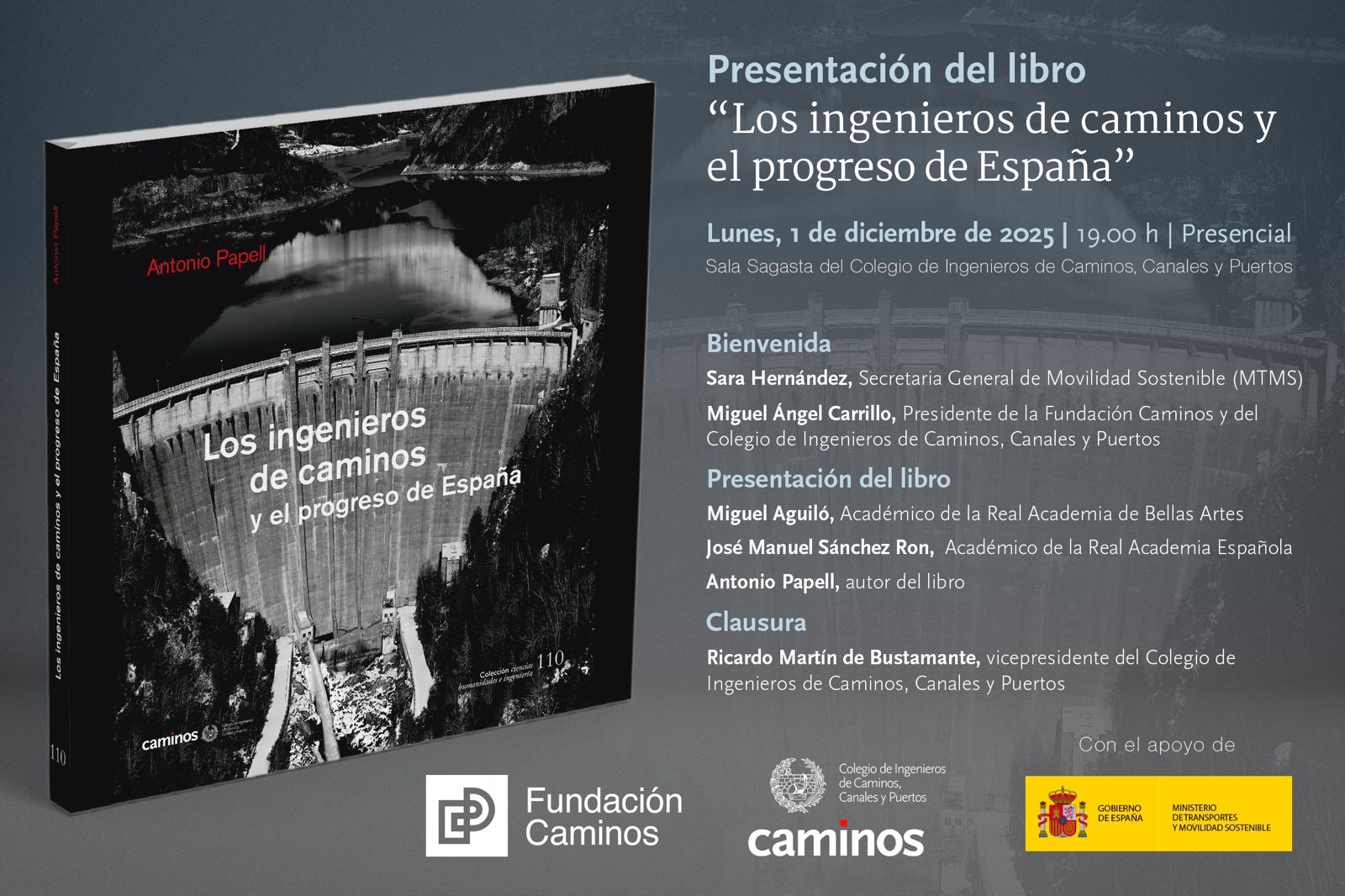 El Colegio de Ingenieros de Caminos, Canales y Puertos, junto con la Fundación Caminos y con el apoyo del Ministerio de Transportes y Movilidad Sostenible, presentan el libro "Los ingenieros de caminos y el progreso de España".