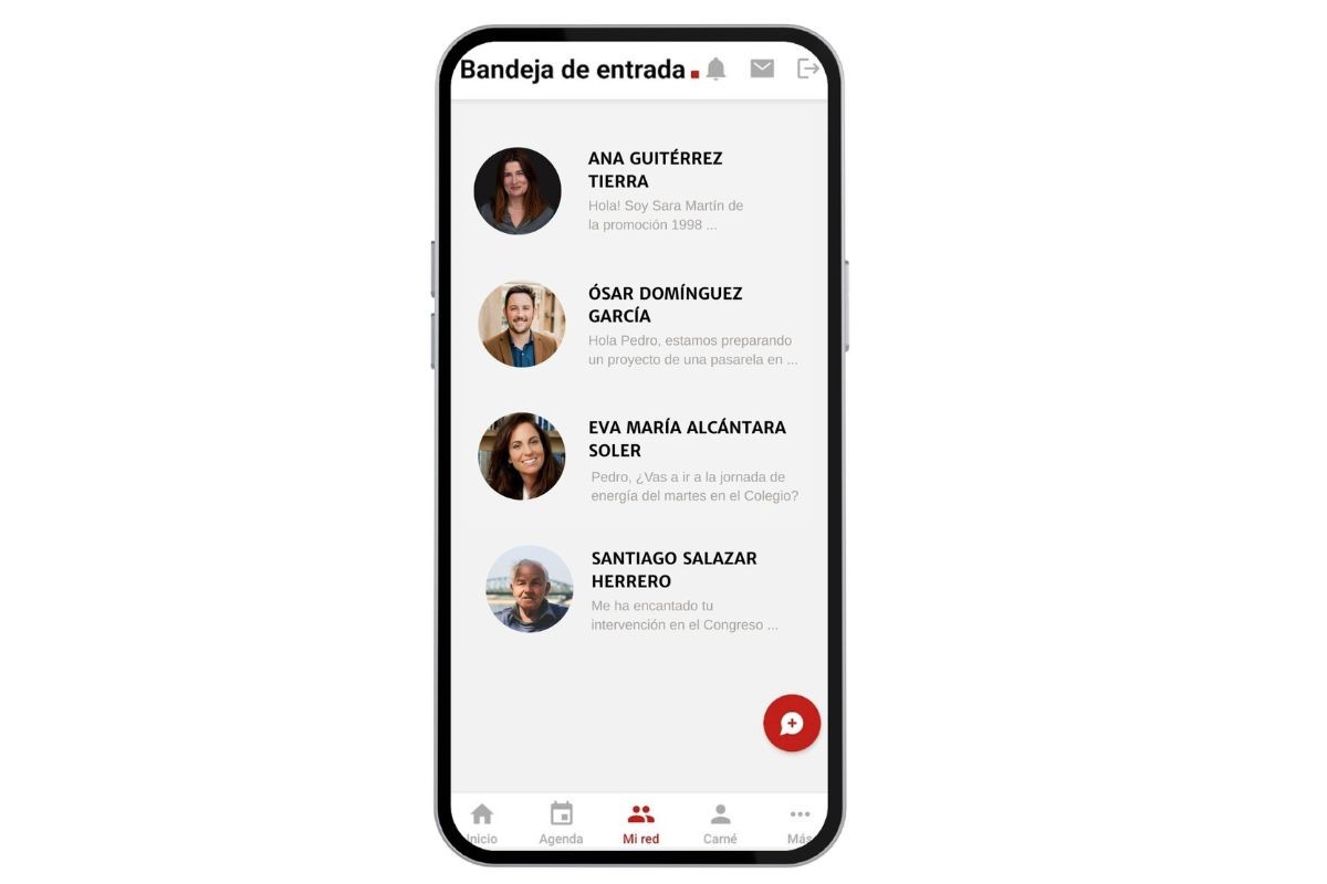 La versión 2.0 de la App “Colegio Caminos” incorpora también una bandeja de entrada de chats, similar a la del Whatsapp, desde la que se puede acceder de forma rápida a las conversaciones mantenidas con otros colegiados. Además, incluye un botón de acceso al buscador de colegiados.