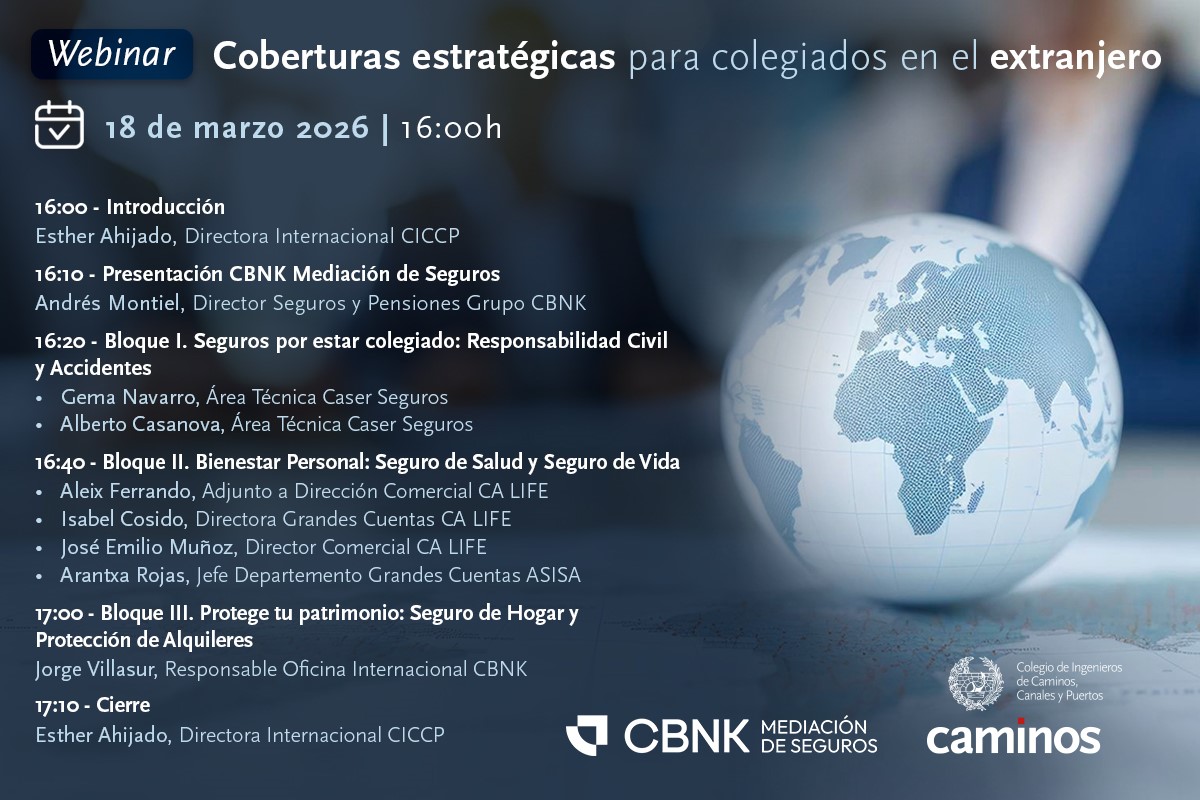 Este webinar, organizado por el Colegio y CBNK Mediación, está dirigido a colegiados que desarrollan o desean desarrollar su actividad profesional en el extranjero y quieren conocer las coberturas aseguradoras más adecuadas para proteger su carrera, su bienestar y su patrimonio.